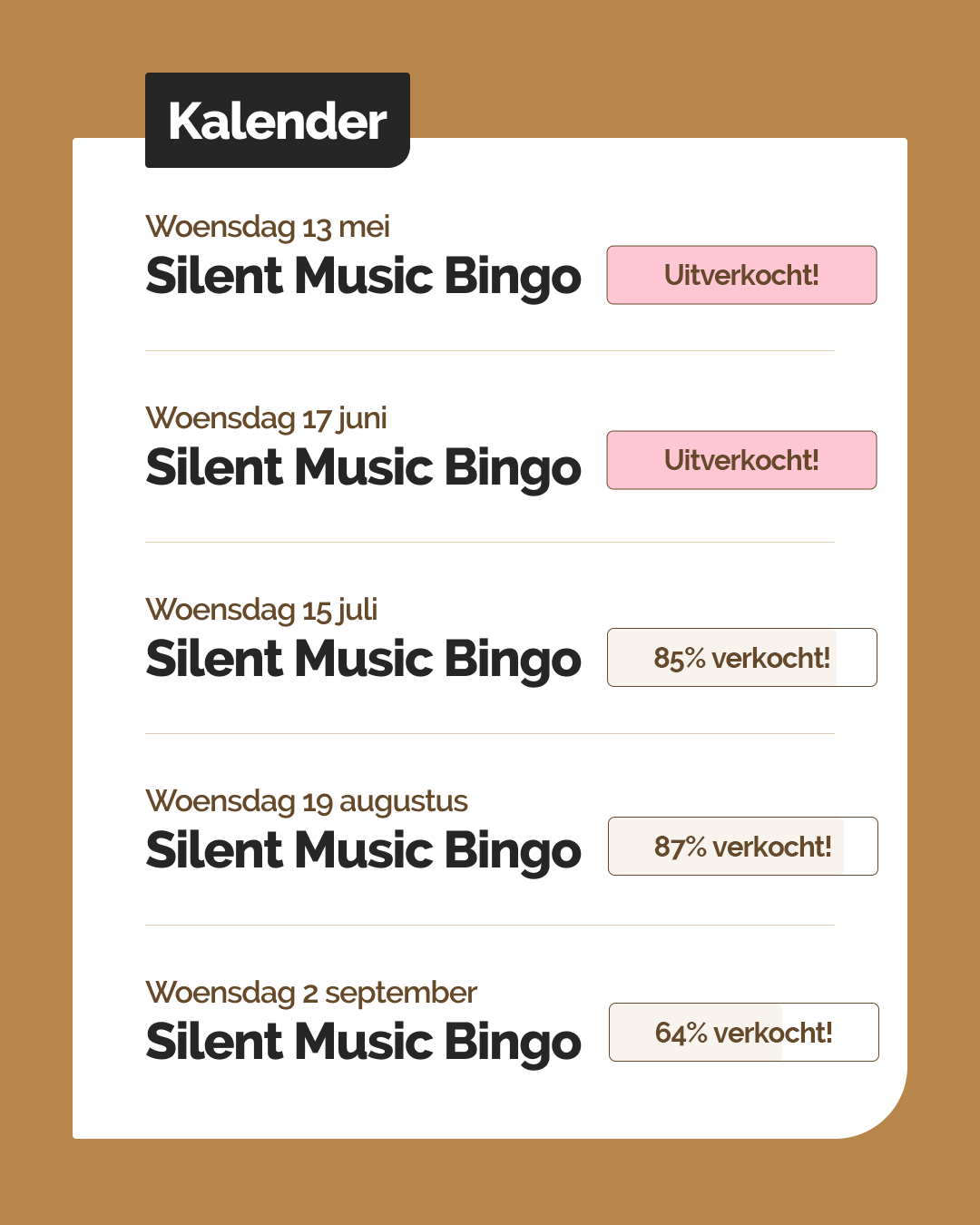 De tickets voor de Silent Music Bingo’s op De Driesprong zijn vanaf nu te bestellen! Ben er snel bij, want de vorige keren waren de tickets snel uitverkocht.